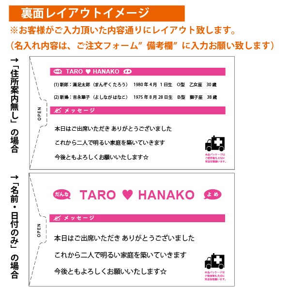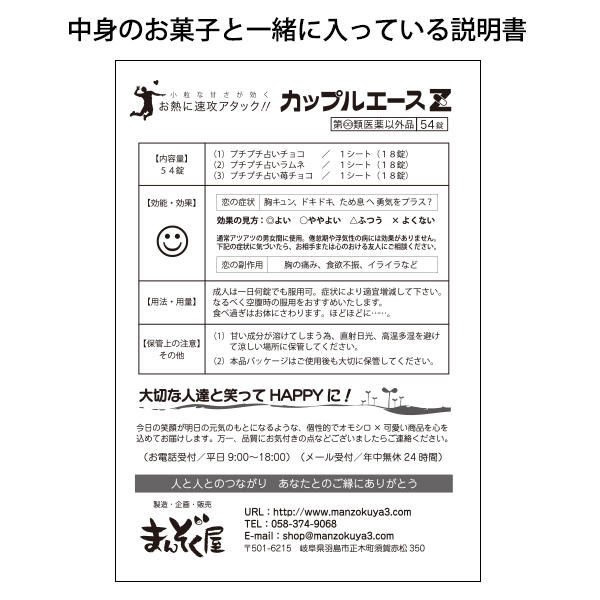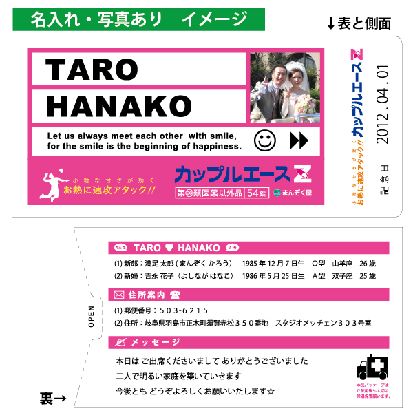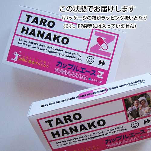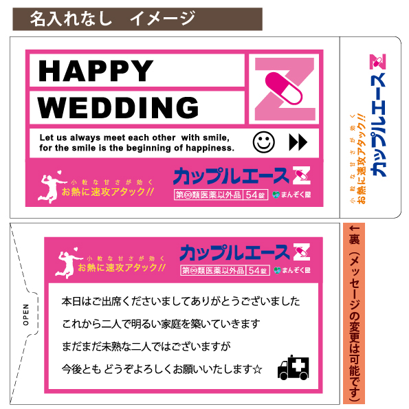![]() ![]() ![]() 前撮りのお写真や、二人の思い出の写真など素敵なお写真をご用意ください。 ゲストのみなさんに2人の事をより知って頂けるギフトとなるでしょう。 お写真以外にも、手書きのイラストや愛する子供・ペットのお写真なんでもござれでございます。(データ支給/JPGE推奨) ![]() ![]() 受け取った瞬間のインパクトなら「カップルエースZ」で間違いありません。 いかにも本物みたいな薬のパッケージに、中身も錠剤にそっくり(?)。 手に取った途端、たちまち盛り上がり、中を開けてもさらに盛り上がる面白すぎるプチギフトです。 ![]() ![]() 2人だけのオリジナルパッケージが最低2個から作ることが出来るこのプチギフト。 パッケージ裏面のデザインは自由度が高いので、二人のプロフィールやメッセージなんかもトコトン私色、俺色に染め上げて下さい! ![]() ![]() お医者さん、看護師さん、薬剤師さん、製薬会社にお勤めの方、ドラッグストアで働いてる方、チャンスです!(ナニガ) また、お二人の出会いが病院だった・・・なんてエピソードの持ち主はお買い求めいただくしかありません! ![]() ![]() 薬師寺さん、薬師神さん、薬袋さん、薬師さん、薬師丸さん、薬丸さん・・・全国でも珍しい名字のそこのアナタ! ・・・ぜひ、ご利用頂きたいです。 ![]() ![]() 占い好きなら、これ以上はない一品です! 占い付きの駄菓子が3つも入っていますから、みなさんに占いの面白さを思い出して楽しんで頂けることでしょう。 ![]() ![]() 「バカップル」と言うと聞こえが悪いかもしれませんが、楽しいことがとことん大好きな お二人にぜひおすすめいたします。他薦の方は、買う以外の道は残されていないかもしれません。 ![]() ![]() こちらのお薬は、どちらかというとお菓子ですが、ある意味、糖分摂取のためのお薬です。 ぷちぷちすると、イライラ解消に一役買うことも出来てしまうすぐれものです。 ![]() ![]() 懐かしい思い出に浸りながら、ご使用ください。現在もなお「お医者さんごっこ」で遊んでみえる方は あまり大きな声では言えませんが、こころゆくまでお楽しみください。 ![]() ![]() そうですね・・・。そんな意見はおかまいなく、のびのびと生活することをおすすめします。 そして、運命のお相手を見つけたアナタは、是非こちらのアイテムをご使用ください。 ![]() ![]() 大変申し訳ございません。病院に行ってから、お買い求めください。 ![]() ![]() カップルエースの名前には↓の意味が込められてます。 「カップル=夫婦・恋人などの一組みの男女」 「エース=最高、最上の存在」 「Z=アルファベットの最後をしめくくる、生涯のパートナー」 世界で一番ステキな2人にぜひお求めいただきたいアイテムです |