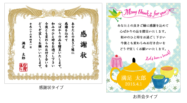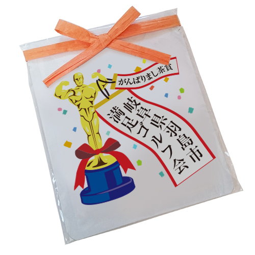 お茶が入ったパッケージに直接お名前を印字したり、退職や出産、卒業や開店祝いなどのノベルティ、還暦報告などのおもしろデザインパッケージ