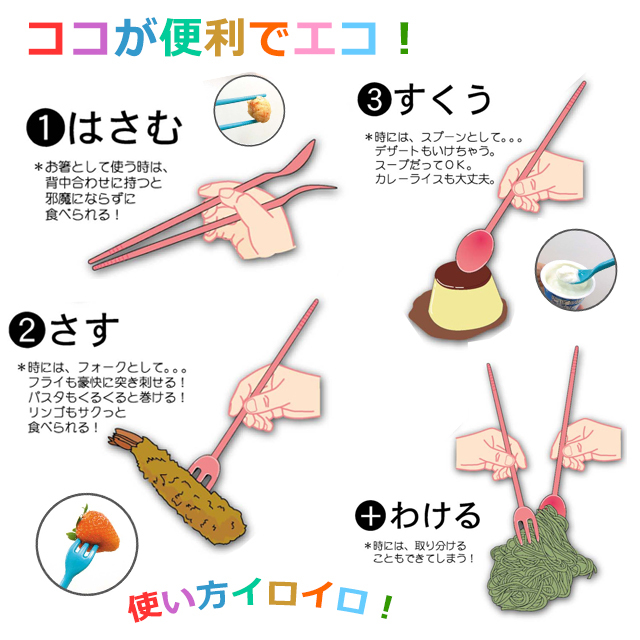 | 説 明 | これお箸なの?!最初は目を疑っちゃうカラフルなエコ箸プチギフト★なんと万能箸!箸、フォーク、スプーンとして使える便利なプチギフトなんです。 ゲストのみんなに配るときもパステルカラーのカラフル演出で目を楽しませてくれる上、実用性も環境にも配慮しちゃうなんてしっかりものの二人だね!ってみんなに思ってもらえそう♪ |