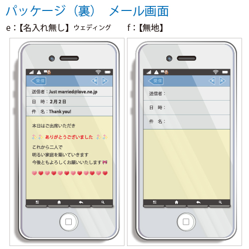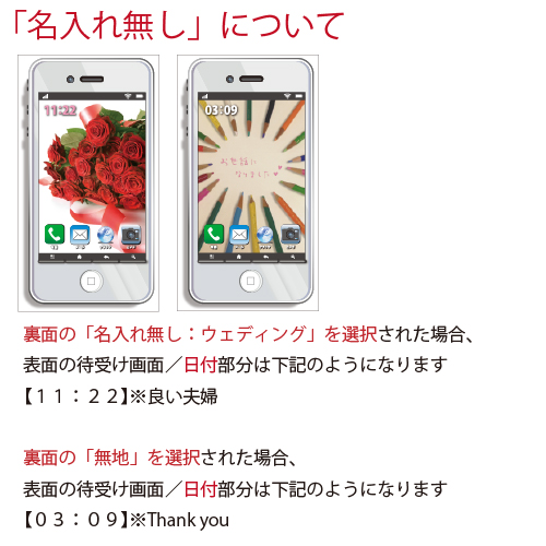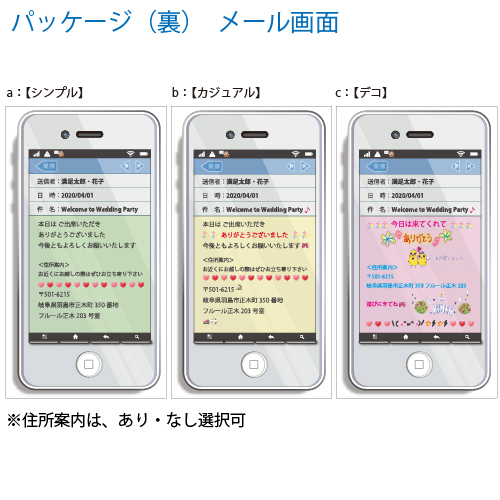 | 注文時に入力が必要な事項 | ※下記の必要事項をご注文画面フォーム、またはお買い物かご【備考欄】に入力してください --------------------- <表面用> ・記念日 <裏面用> ・送信者:お二人のお名前(漢字/フルネームで) ・日時:記念日 ※西暦含む ・件名:Welome to Wedding Party♪ (※定型文、変更可) ・本文:各デザイン定型メッセージ (※変更可 30文字程度) ・住所案内(〒から) |