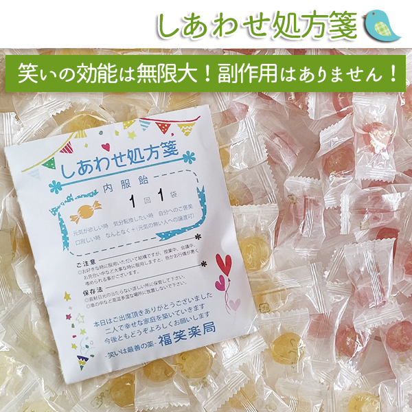 | 説 明 | くすっと笑顔にしてくれる「幸せ」処方いたします。プチギフトの中身はカラフルなキャンディ。お薬の袋みたいなパッケージには名前やメッセージが入れられるので、オリジナルプチギフトが作れちゃいます! |