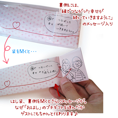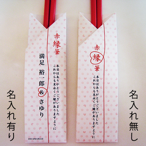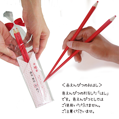 | 説 明 | 赤い糸で結ばれた運命の2人からお渡しする「赤縁筆のプチギフト」。見た目は赤い色えんぴつなんだけど、開けるとびっくり!お箸なんです!誰でも使えるお箸はいくつあっても便利なもの。ゲストとのご縁を大切にするプチギフトで絆を深めませんか? |