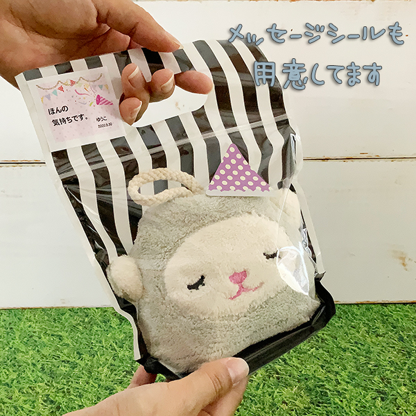 紐つきの掛けられる手拭きタオル ループ付きのタオルハンカチです。トイレ・キッチン・洗面所・ベビーカーなど色々な所にかけて手ふきタオルとして活躍!動物のかわいいマスコットの中にくるくると収納できます。 キャラクターはねこ・くま・ひつじの3種類 男の子や女の子のキッズをはじめ女性にも!人気のプチ ギフトです。保育園の入園祝い、卒園式、退園や転園、引っ越しの挨拶、誕生日会、発表会、結婚式の子供向けの贈り物におすすめです。また、クリスマスやホワイトデーなどのイベントにも! メッセージシールが無料で付けれます 感謝、ありがとうを伝えるオリジナルメッセージに対応していますので、お礼・お返し、内祝いなどにもご利用いただけます。名前入れをして可愛く伝えてることが出来ます ラッピングしてお届けします (写真の黒ストライプの袋に入った状態)1個づつ個包装(小分け包装)している為、ぷちギフトとして渡す時も便利です。 まとめ買いも対応可能! ノベルティや粗品・景品としてご利用頂けます。大量に必要な方は在庫・納期をお問い合わせください。 |