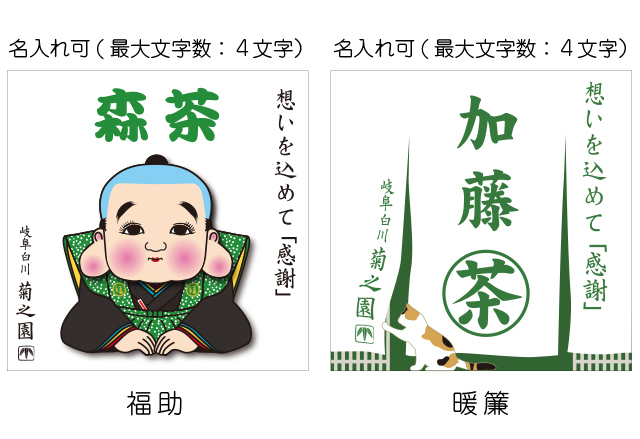| 注文時に入力が必要な事項 | ※下記の必要事項をご注文画面フォーム、またはお買い物かご【備考欄】に入力してください --------------------- ・お茶パッケージのお名前(最大4文字まで) ・挨拶カードのお名前 ・あいさつカードの日付(※西暦含む)(※任意) |